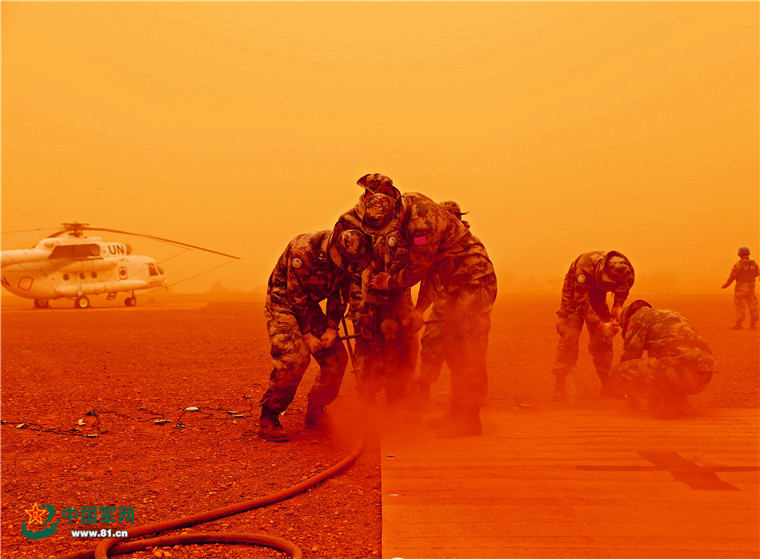 中国赴马里维和工兵分队在风沙中修建加奥机场防御设施。驻马团东站区最高行政长官哈提姆赞誉“中国工兵不愧为驻马团典范”。赵佳明 摄
