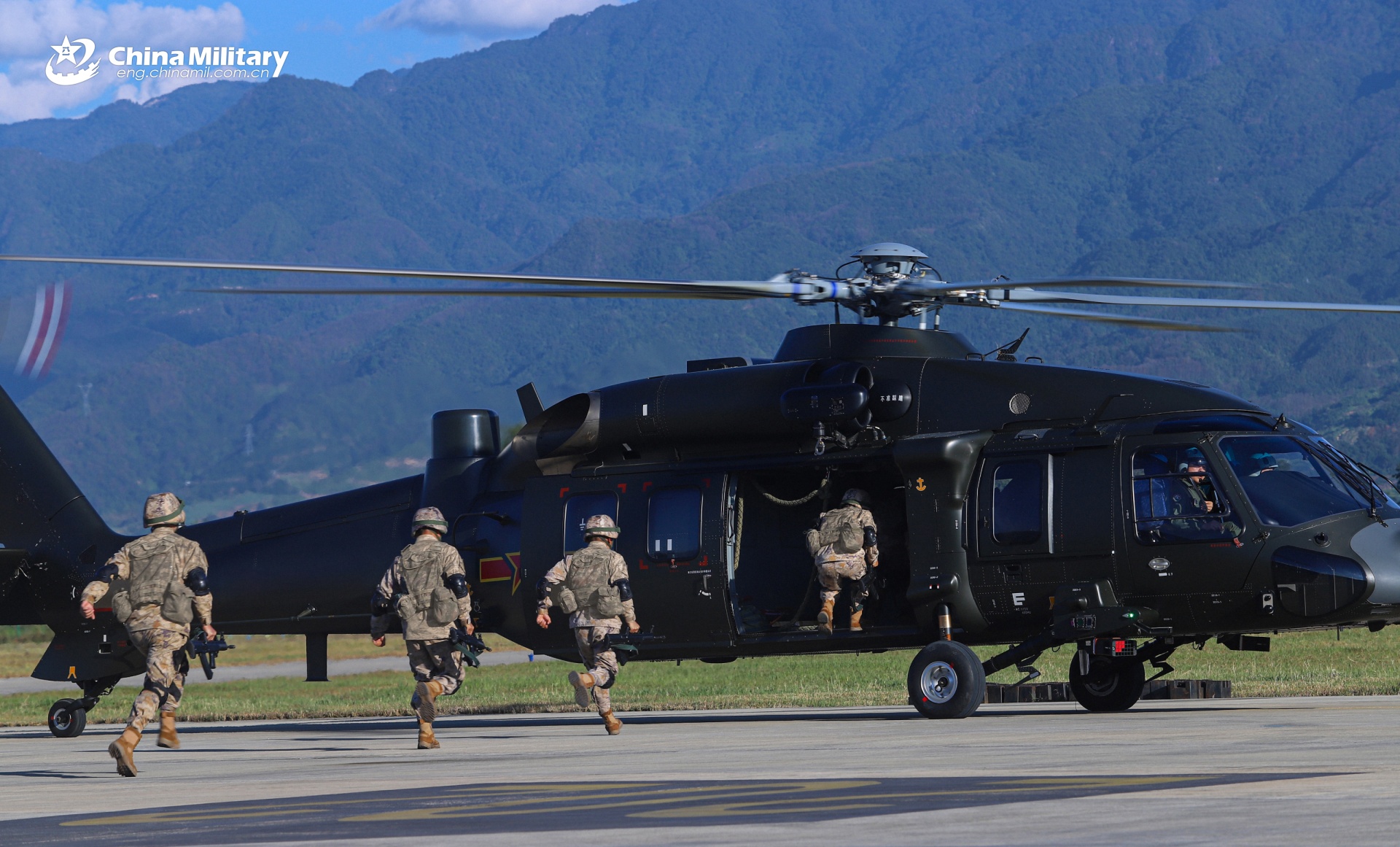 Soldiers assigned to a brigade under the Chinese PLA 75th Group Army board a Z-20 utility medium-lift helicopter during a ground-aerial coordination training exercise in later November, 2025. (eng.chinamil.com.cn/Photo by Liu Weili)11月下旬,第75集团军某旅开展空地协同训练,锤炼官兵协同作战能力。图为突击队员快速登机。(英文中国军网/刘维礼 摄)