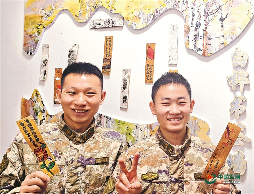 两名战士展示用树皮制作的书签。马庆睿 摄