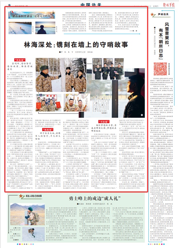 当原创歌曲《守望边疆》旋律响起时,雪野巡线的足迹、战友互助的身影……一幕幕场景在他脑海中浮现。比赛归来,他将这份荣耀贴上了“笑脸墙”:“在哨所,每份坚守、每份收获,都值得被看见。”