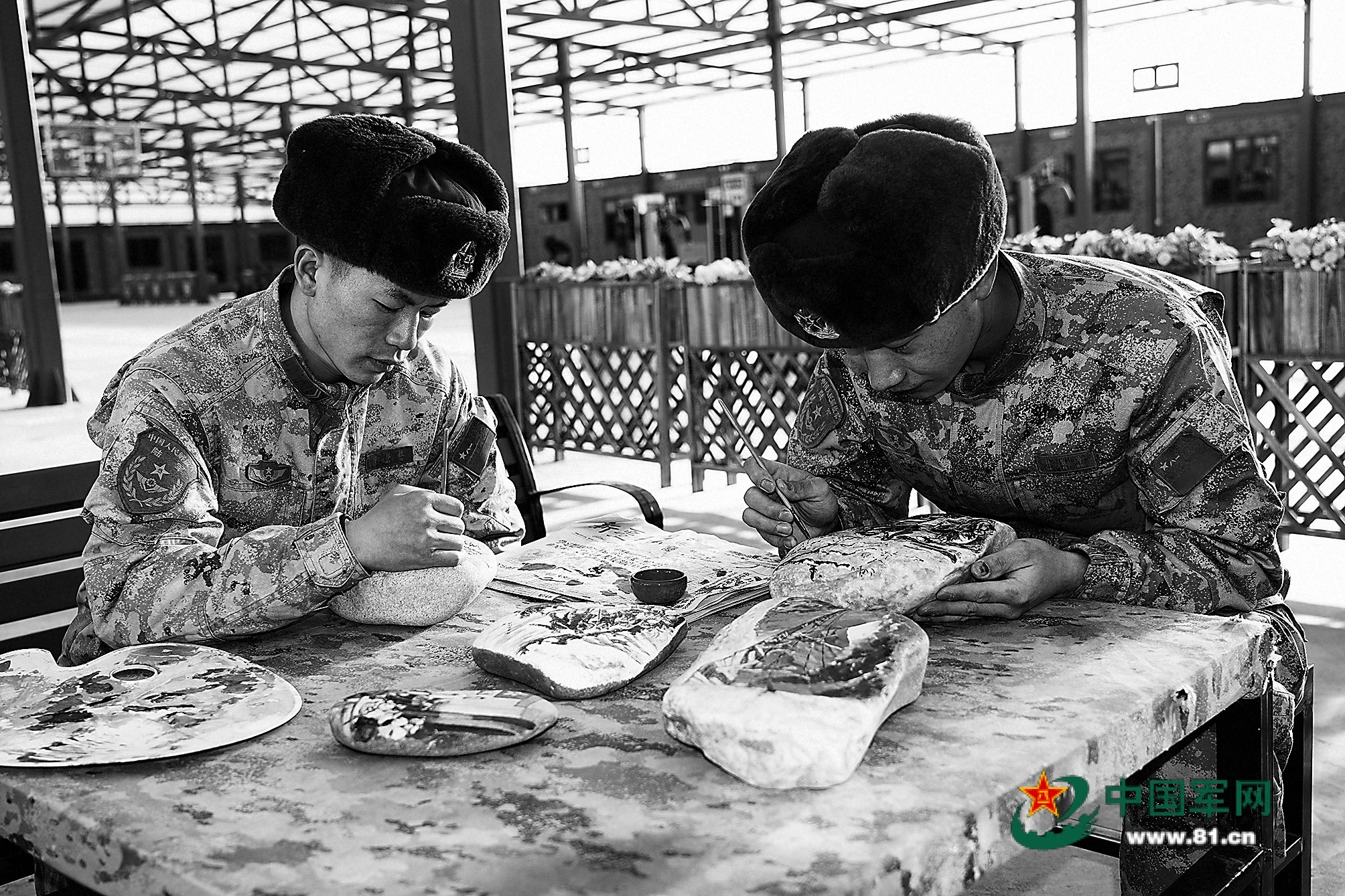 战士描绘石头画。