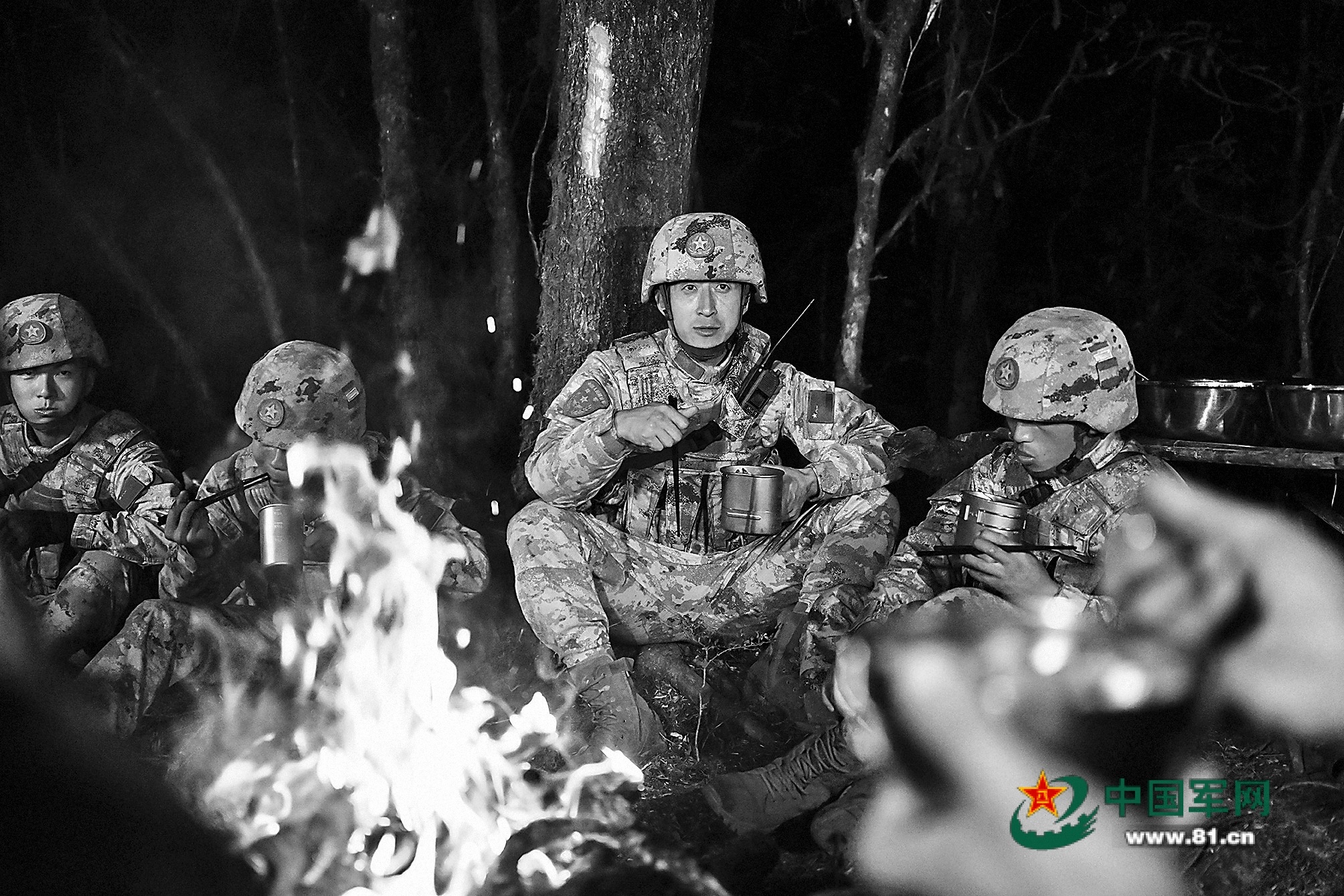巡逻间隙,官兵点燃篝火取暖。