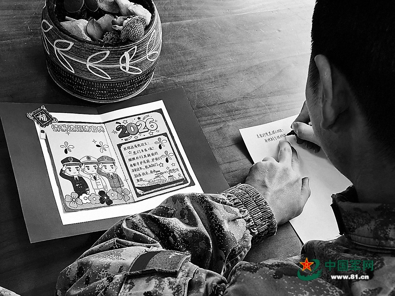 连里组织“写一封家书”活动——请官兵将说不出口的情感,写在信纸上。一级上士闫航辉铺开信纸,告诉妻女新营房很暖和,星星仿佛近在咫尺。他还画了一幅简笔画:一名军人站在雪山前,身旁有座闪光的营房,远处天空挂着彩虹。