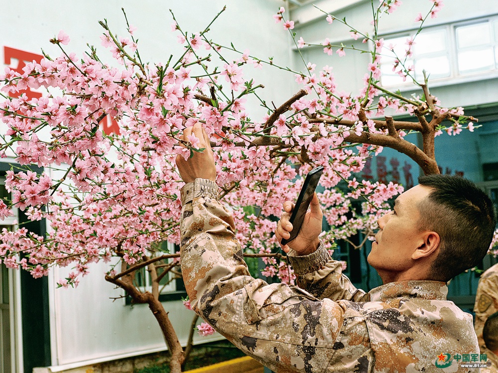 战士拨打视频电话与家人分享桃花盛开的喜讯。