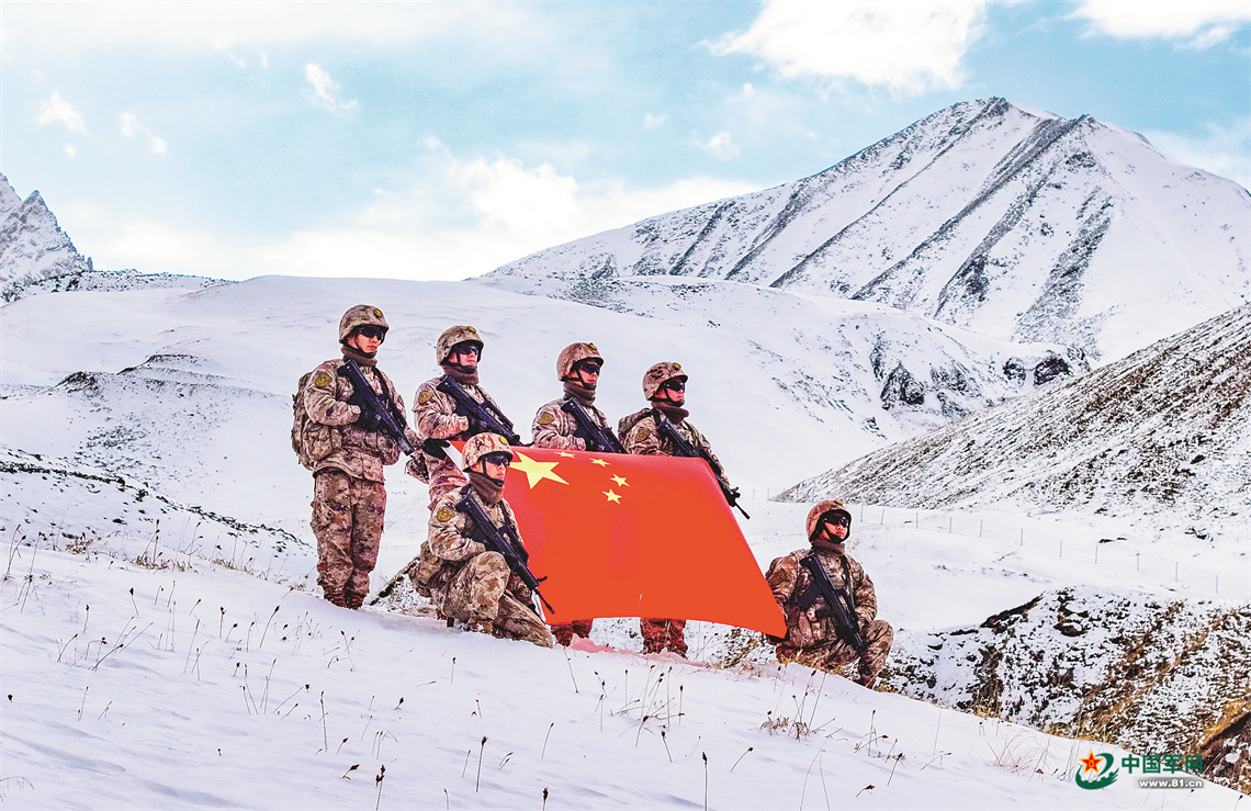 经过艰难跋涉,巡逻小分队终于抵达目的地。“边防有我在,祖国请放心!”鲜艳的五星红旗与官兵通红的面庞相互映衬,在镜头中定格成永恒。