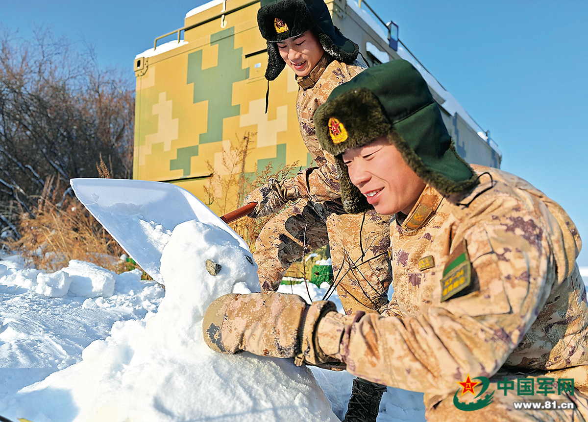 王磊和战友在哨点门前堆砌雪塑。王冠铭、黄泓源摄