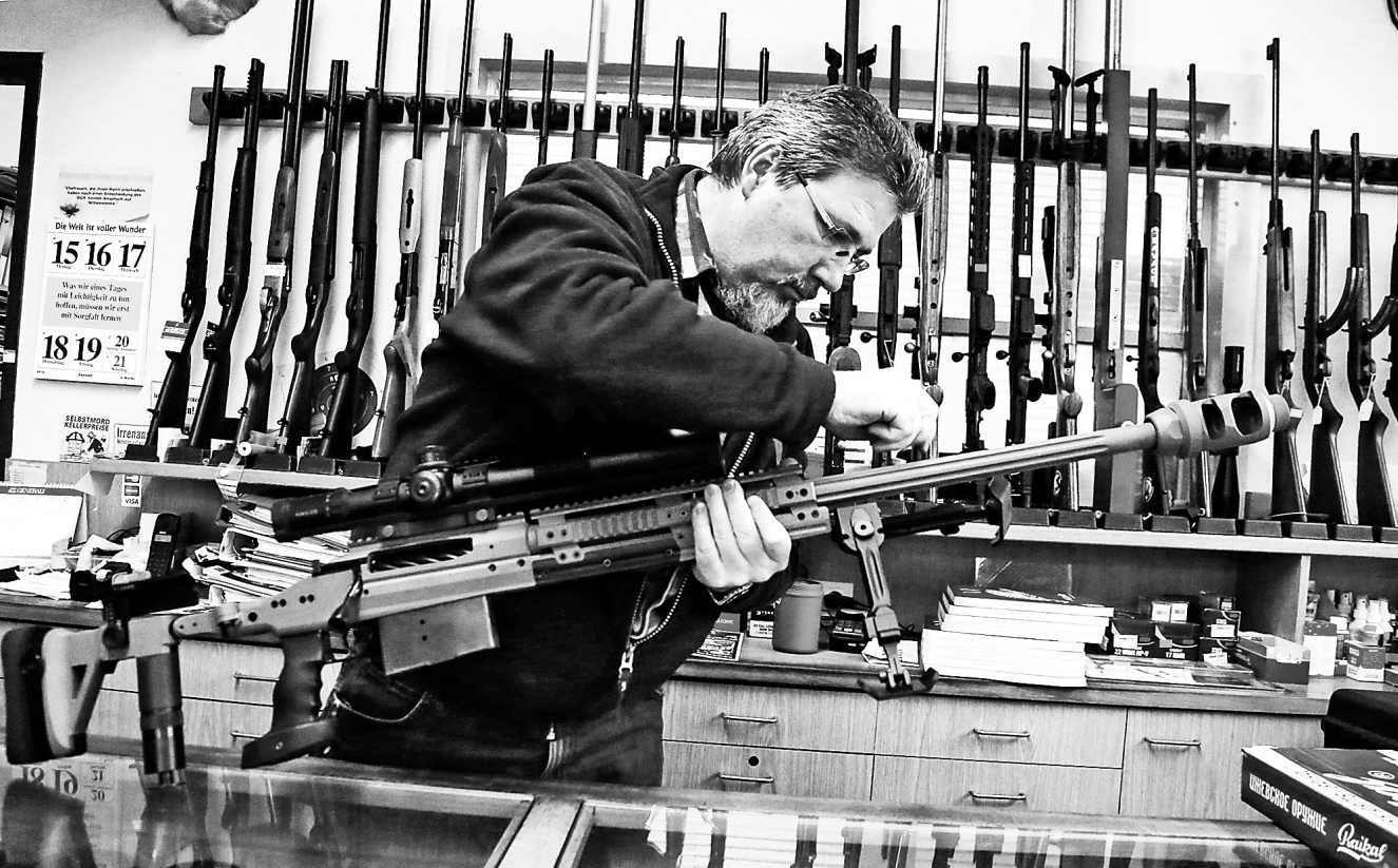在奥地利维也纳一家武器专卖店,店主检查一支狙击步枪。新华社发