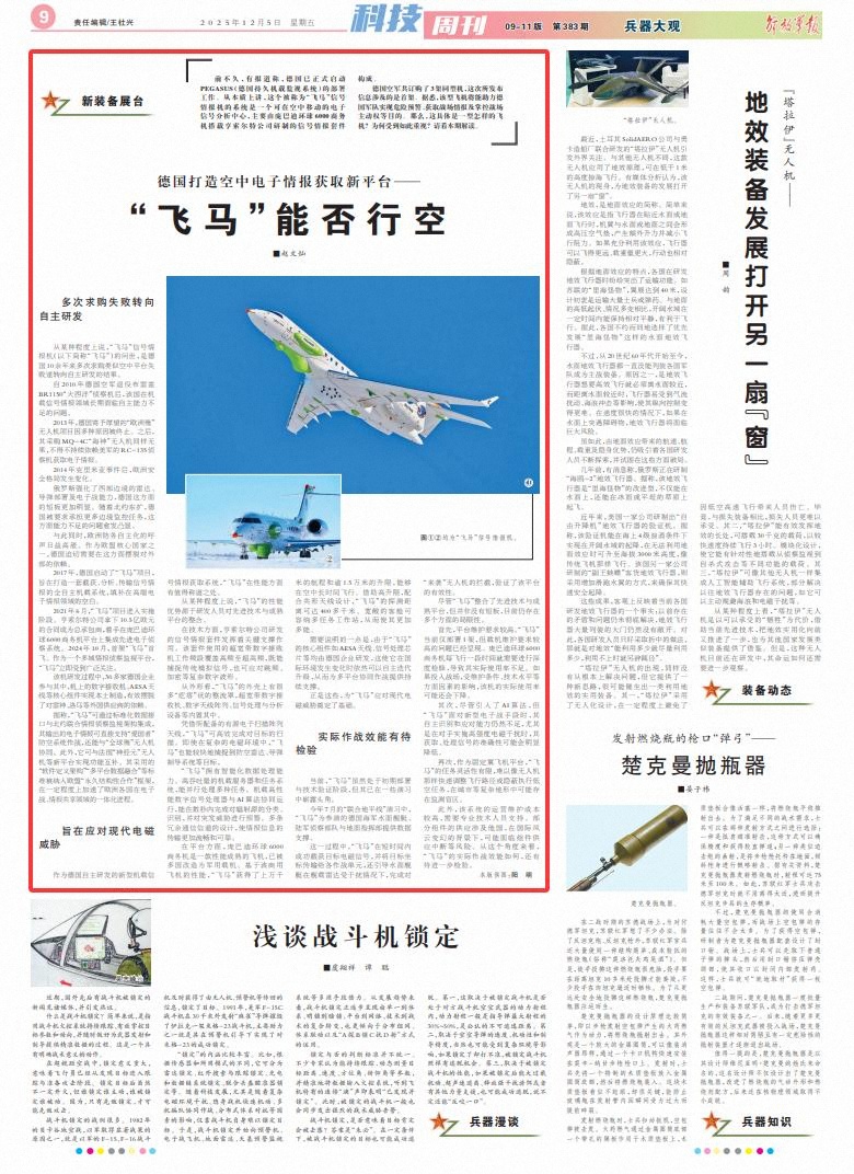 2017年,德国启动了“飞马”项目,旨在打造一套截获、分析、传输信号情报的全自主机载系统,填补在高端电子情报领域的空白。