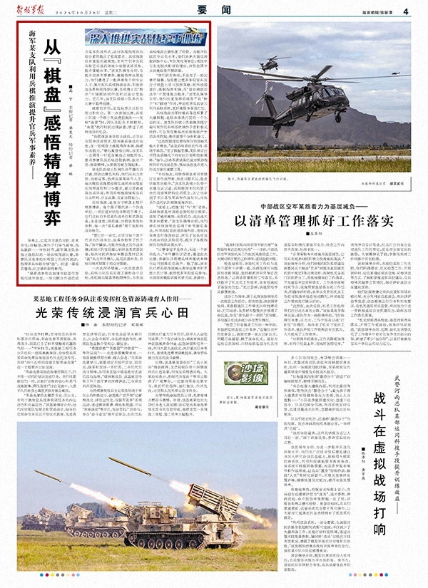 “随着战争形态加速向信息化智能化战争演变,一体化联合作战已成为基本作战形式,这对各级指挥员的综合素质提出了更高要求。兵棋推演具有很强的逼真度,有利于引导官兵在贴近实战的环境中培塑战场思维、提升谋略水平。”该支队领导介绍,为提升官兵军事素养、练强指挥决策能力,他们遴选了一批训练骨干和专业人才,集中组织兵棋推演培训,积极参加各类兵棋推演比赛,在棋盘上的“厮杀”中锤炼协同作战和应急应变能力。近几年,该支队兵棋小队多次在比赛中取得佳绩。