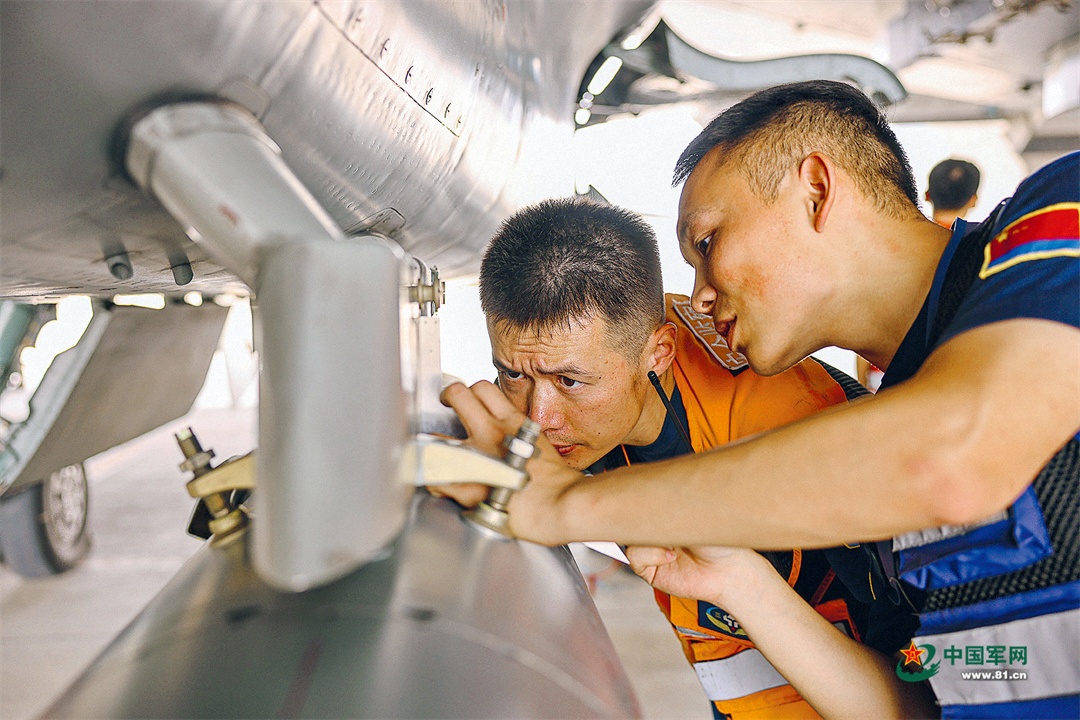 7月上旬,空军航空兵某部开展飞行训练。图为飞行前机务人员正在仔细检查。崔家赫 摄
