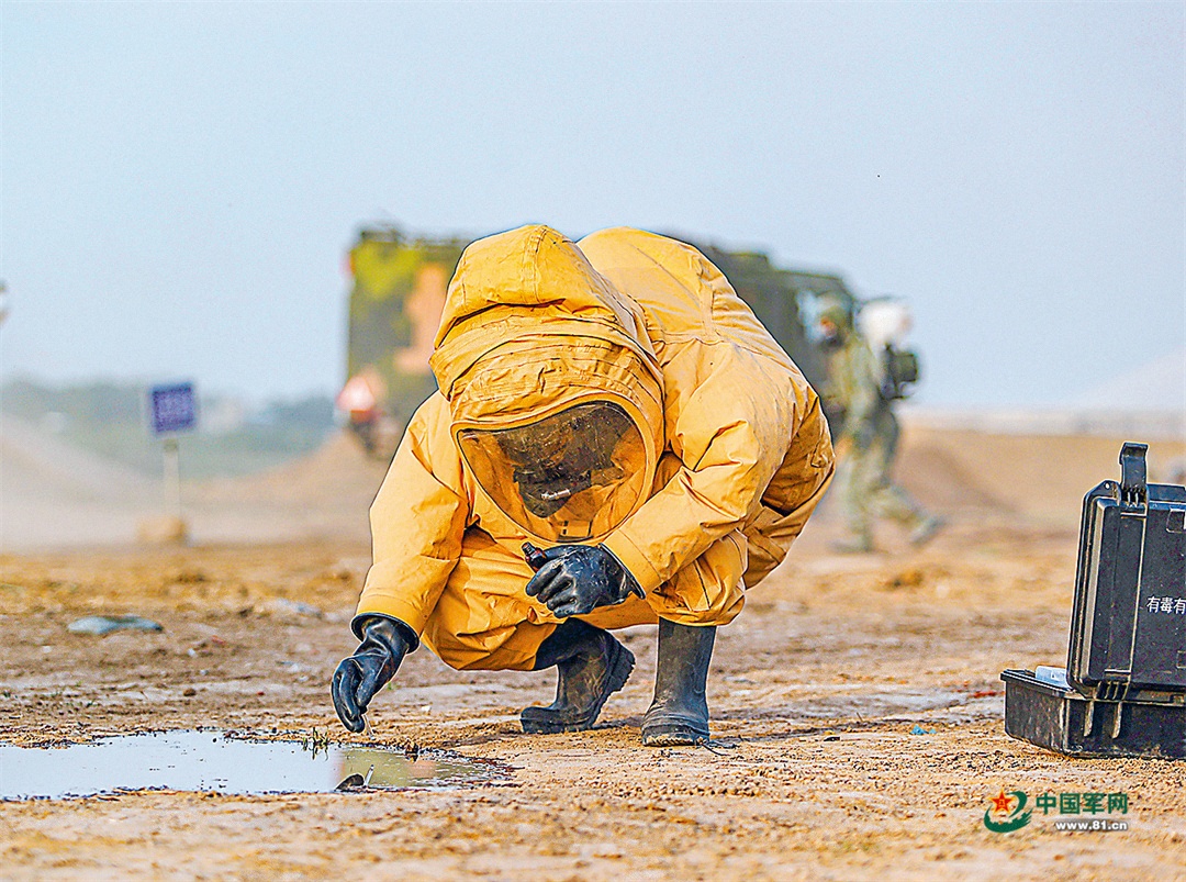 前不久,陆军某旅防化分队开展应急救援训练。图为一名战士正在认真采集染“毒”样品。 宋春堂 摄
