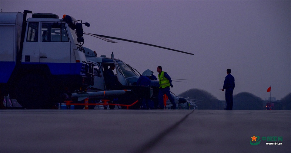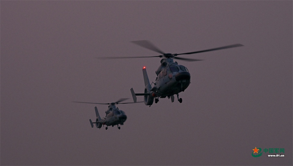 夜色如墨,数架直升机依次升空,呼啸着向目标海域突进。抵达目标空域后,编队迅速转入搜索识别课目。飞行员利用机载雷达和光电设备,在复杂海况下快速锁定目标,完成识别确认后迅即脱离,动作精准连贯。训练过程中,编队还完成了横队、纵队等多种队形变换,飞行员紧盯仪表数据,精准操控战机,始终保持编队协同一致。
