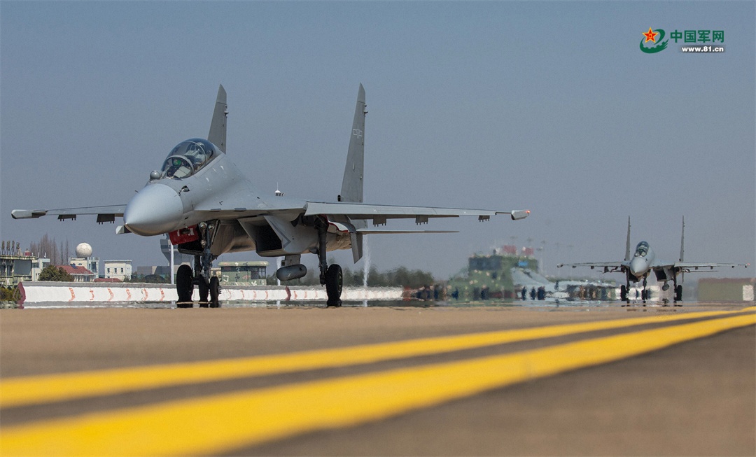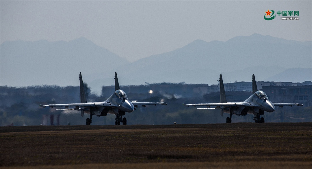 近日,东部战区空军航空兵某旅组织飞行训练。伴着巨大轰鸣声,一架架战机接续升空,奔赴训练空域。