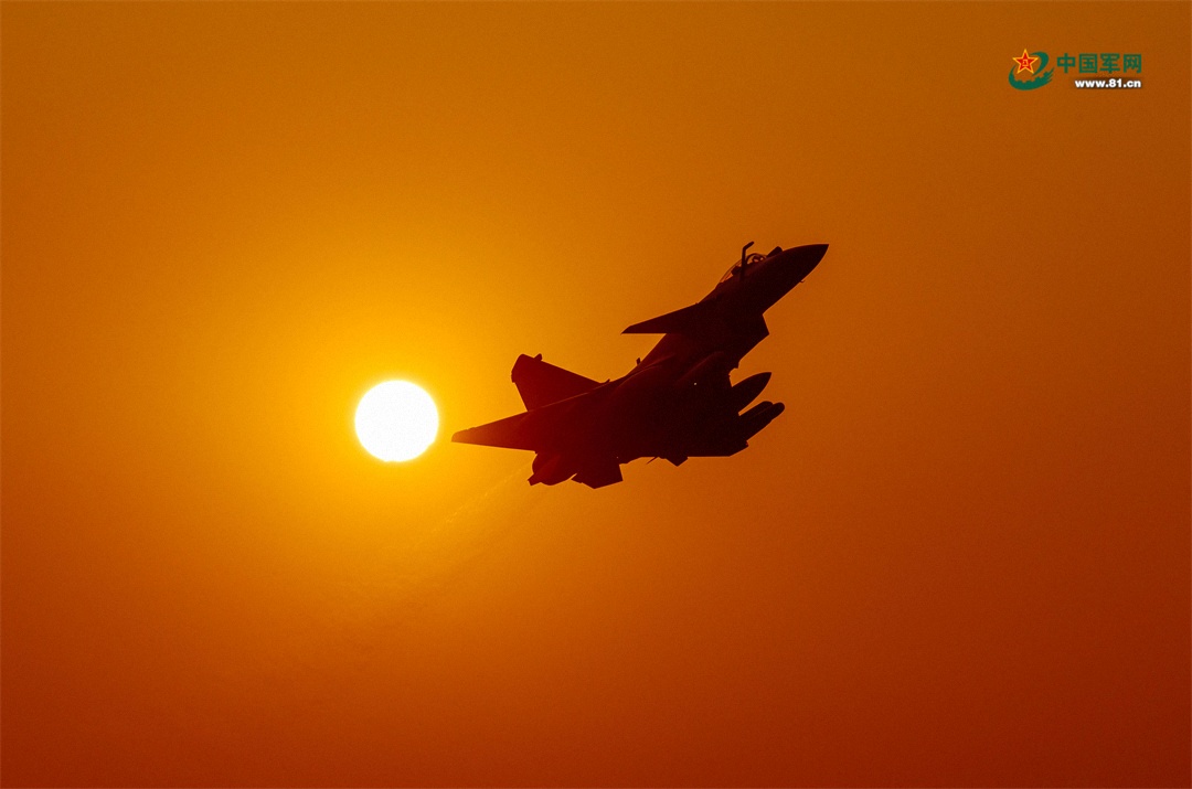 战机伴着晚霞升空。黄国泰 摄