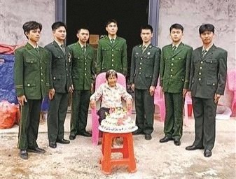 海南省海口市玉冯村七名青年身穿戎装为奶奶过生日——