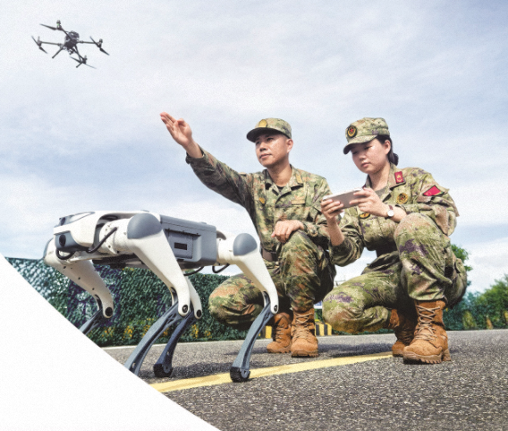 谢亮(左)指导民兵操控机器狗进行侦察训练。