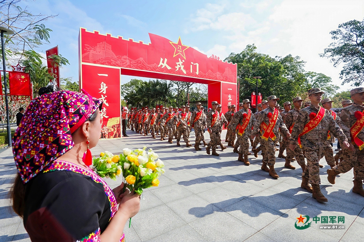 入伍新兵们穿过“从戎门”