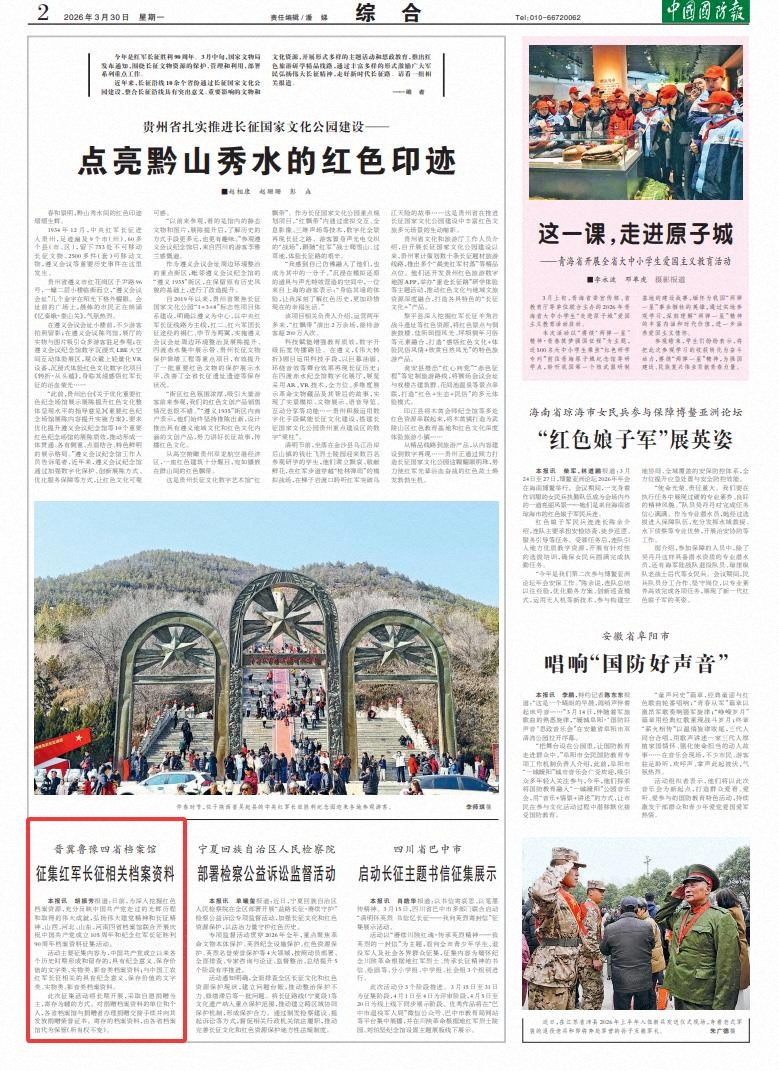 中国国防报讯 胡振芳报道:日前,为深入挖掘红色档案资源,充分反映中国共产党走过的光辉历程和取得的伟大成就,弘扬伟大建党精神和长征精神,山西、河北、山东、河南四省档案馆联合开展庆祝中国共产党成立105周年和纪念红军长征胜利90周年档案资料征集活动。
