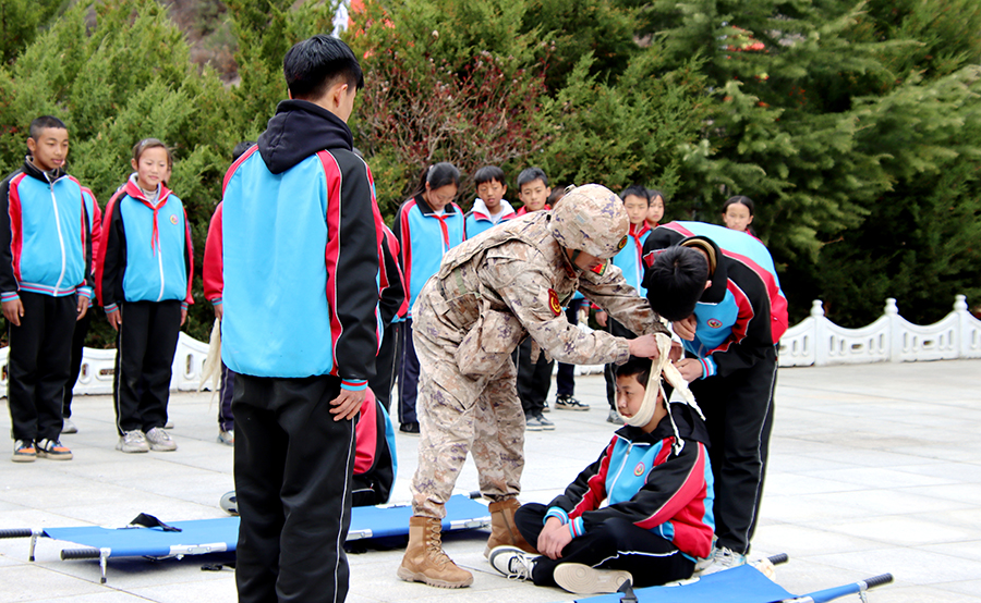 实训场上,人武部民兵教练员化身国防教官,现场讲授战伤救护、瞄准射击、战术基础等军事技能,细致讲解、规范示范。学生们分组开展实操训练,在协同包扎、模拟匍匐、后勤输送等实践中,锤炼动手能力与协作意识。教练员结合长征战场真实战例,将技能教学与红色精神传承相结合,引导青少年深知和平珍贵、牢记强军使命。