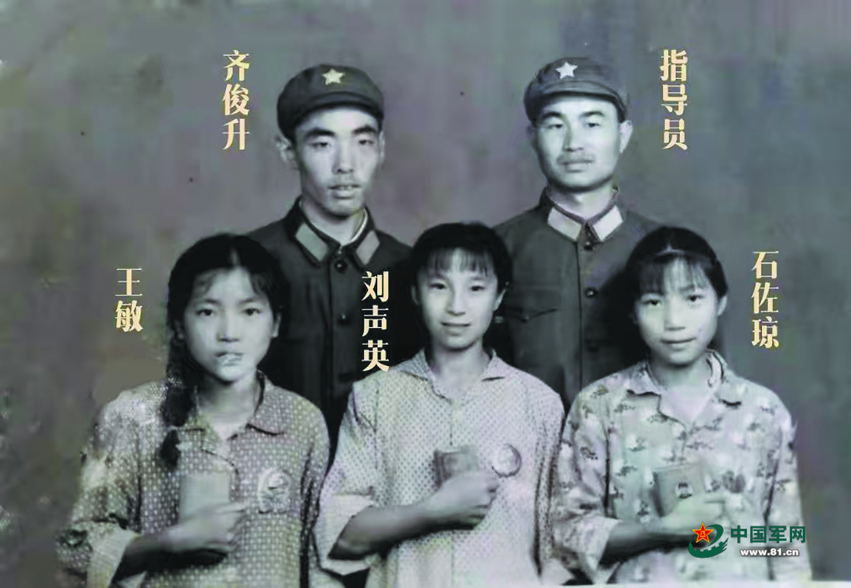 50余年前,3名被救小姑娘与齐俊升及连队指导员合影。