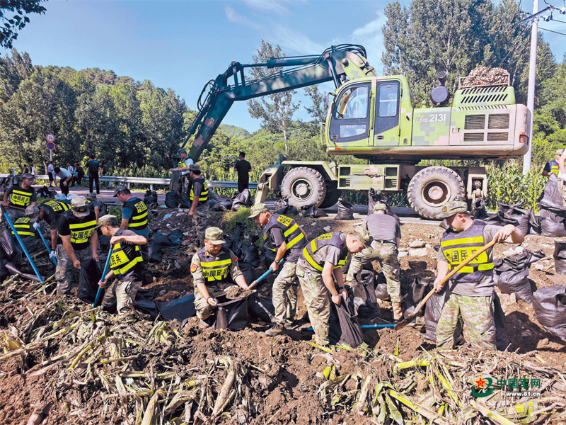 七月二十九日,河北省滦平县人武部组织民兵在马营子满族乡王北沟门大桥附近转运沙袋,加固堤坝。谭一村 摄