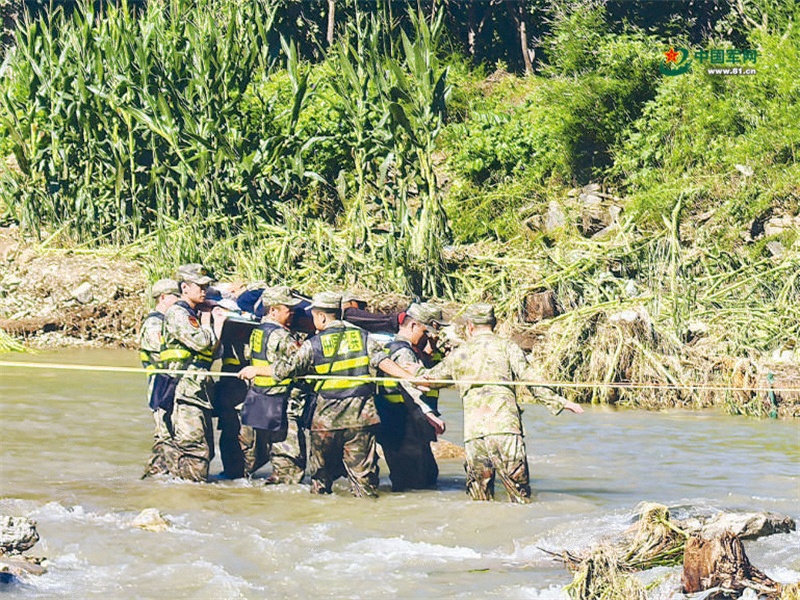 “担架过来了,做好准备。”向另一岸望去,七八名身着作训服的民兵正抬着担架走来,有的拉紧绳索,努力保持身体平衡;有的站在绳索另一侧,一字排开组成人墙。