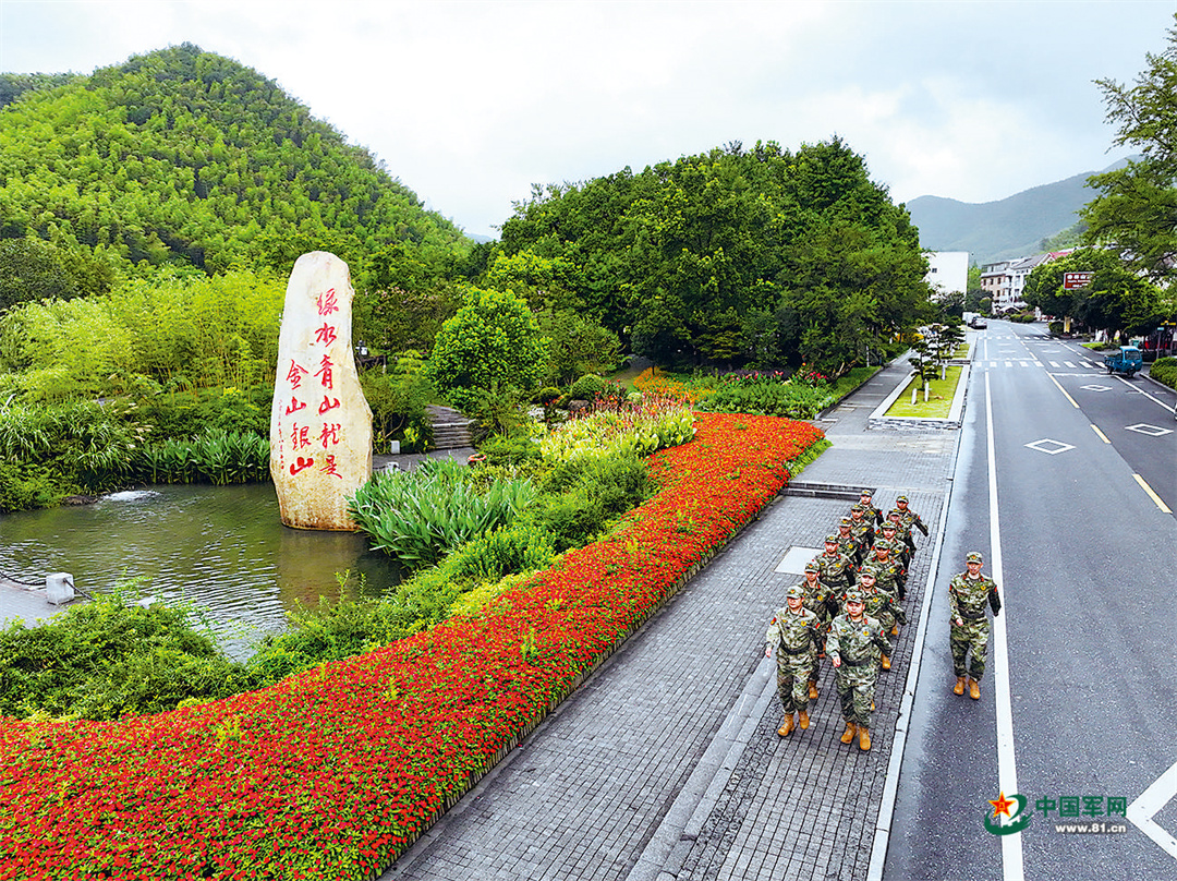 7月28日,浙江省安吉县余村村民兵连在余村景区巡逻。胡江涛 摄