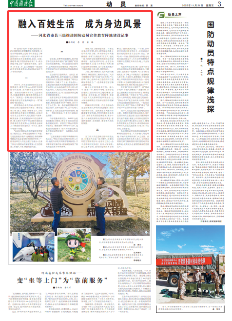 融入社区宣传教育工作。唐山市、张家口市、廊坊市等地,在部分社区建成以国防动员为主题的雕塑、游戏转盘、文化长廊、打卡相框等,丰富了社区文化元素和居民日常生活,让大家在潜移默化中加深对国防的理解和感情。