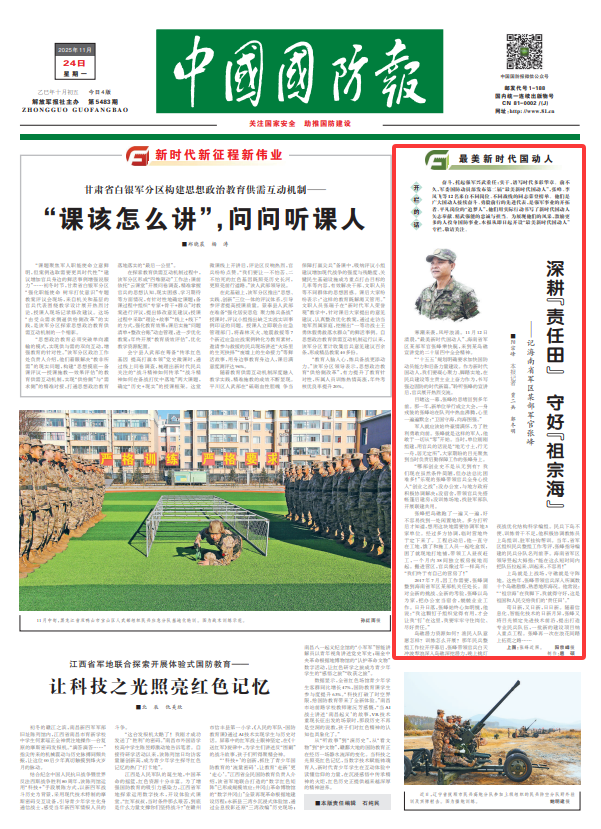 上岛就是上战场,守礁就是守阵地。这些年,张峰带领官兵深入所属数十个岛礁勘察,熟悉地形海况。他常说:“‘祖宗海’在我脚下,我就得守好,这是祖国和人民交给我们的‘责任田’。”
