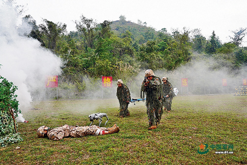 连日来,广西崇左军分区组织民兵分队奔赴野外训练场开展新型装备操作运用训练。图为民兵在机器狗引导下搜救“伤员”。许磊磊摄