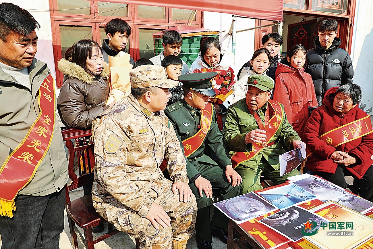 活泼的孩子把张波团团围住,指着立功喜报问这问那,尽管一个个小脸蛋被冻得通红,眉眼间却写满崇敬。几名适龄青年与吴孝新、张波合影后,便和前来送喜报的工作人员攀谈起来。走近一听,他们是在聊参军入伍的事……