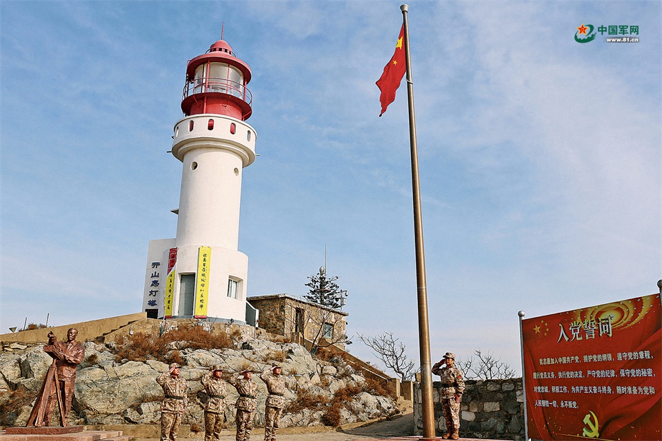 春节期间,“时代楷模”王仕花回到开山岛,与守岛民兵一起贴春联、包饺子,并带领大家升国旗。张学彦 摄