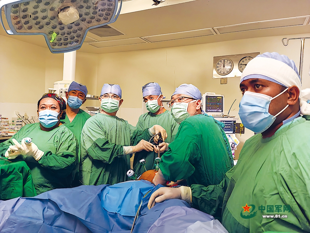 10月6日,在斐济首都苏瓦,“丝路方舟”号医院船医生与当地医生为患者进行手术。崔晓洋摄
