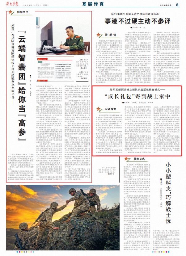 “成长礼包”送军属是海军某部探索建立部队家庭联教联育模式开展的活动。此前,他们在调研时发现一个情况:在与家人沟通时,战士出于各种考量,往往以“都挺好”“别问了”之类的回答应对询问。这很容易让军属产生不必要的担忧,但过多追问,又可能引发矛盾甚至失泄密问题。
