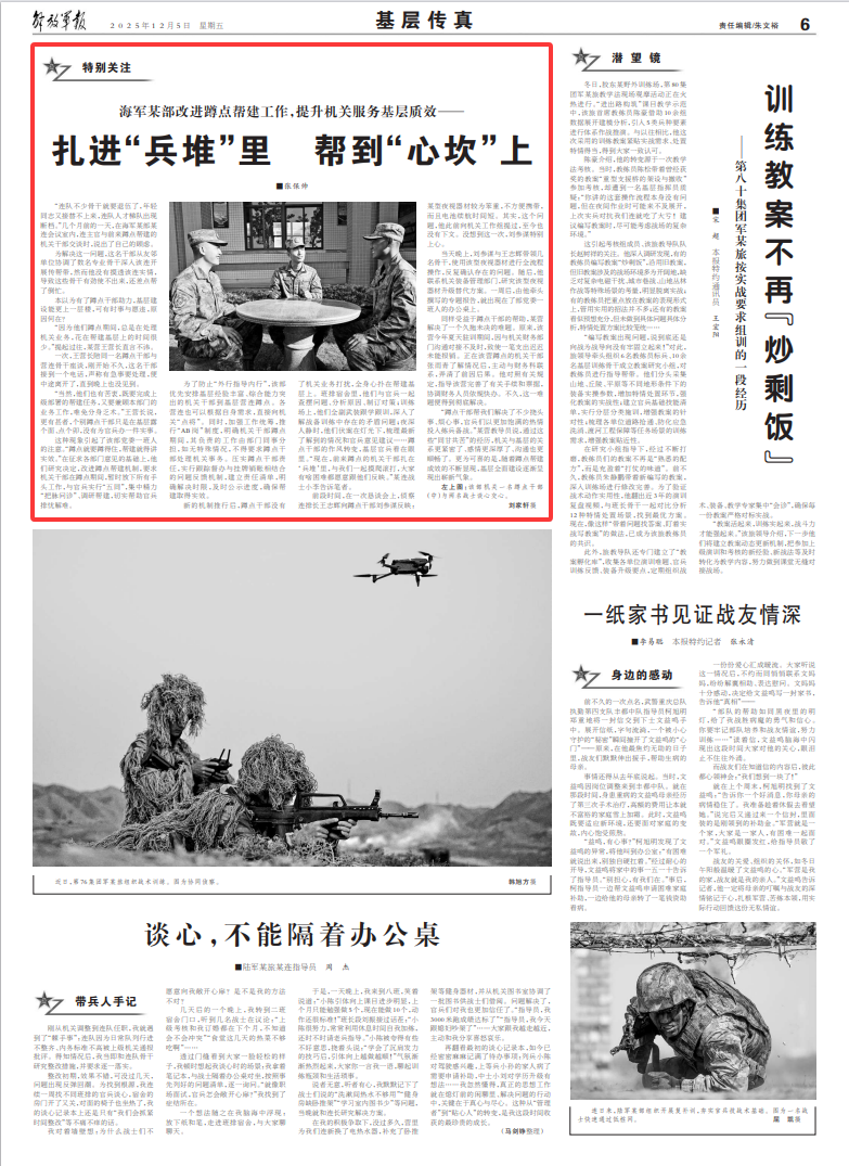 “蹲点干部帮我们解决了不少挠头事、烦心事,官兵们以更加饱满的热情投入练兵备战。”某营教导员说,通过这些“同甘共苦”的经历,机关与基层的关系更紧密了、感情更深厚了、沟通也更顺畅了。更为可喜的是,随着蹲点帮建成效的不断显现,基层全面建设逐渐呈现出崭新气象。
