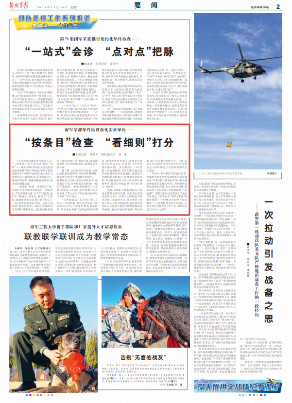 “年终检查是一项系统工程,必须统一评价标准、强化实效导向。”该部领导介绍,今年年终检查筹备阶段,机关各业务部门按照法规条令要求,梳理年终检查重点,邀请军队院校专家参与论证,研究制订《年终检查实施方案》。该方案列出了4大类数十项检查细则,不仅明确了相应条目的检查内容和分值建议,还将官兵对教育的感悟体会、反馈建议等软指标,作为检查教育工作实际效果的重要参考,推动年终检查从“凭印象”转为“看细则”。