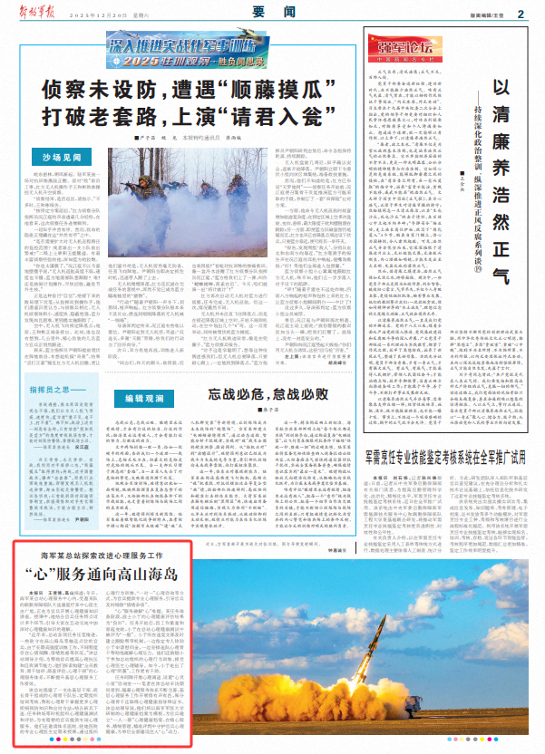 “近年来,总站各项任务压茬推进,一些驻守在高山海岛等偏远点位的官兵,由于长期高强度训练工作,不同程度存在心情烦躁、情绪焦虑等状况。”该总站领导介绍,为帮助官兵提高心理抗压和自我调节能力,他们探索构建“全员教育、骨干培训、筛查评估、心理干预”的心理服务体系,不断提升基层心理服务工作质效。