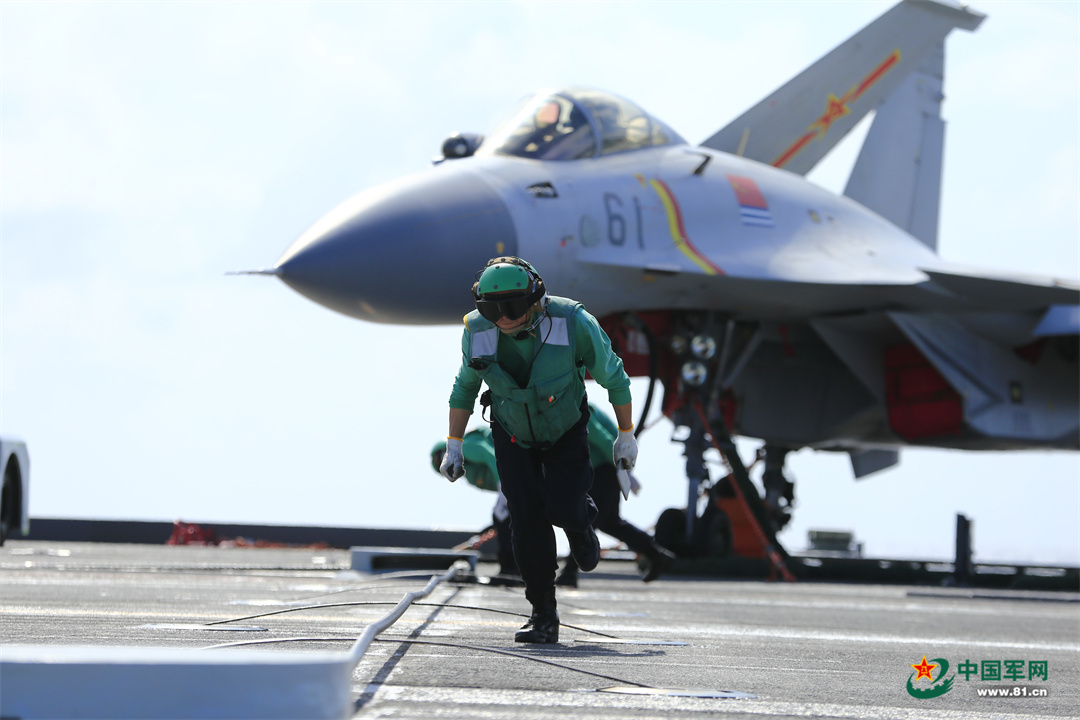 海军山东舰起降保障中队起飞助理员在确认舰载战斗机状态完好后,给出释放手势。李刚 摄