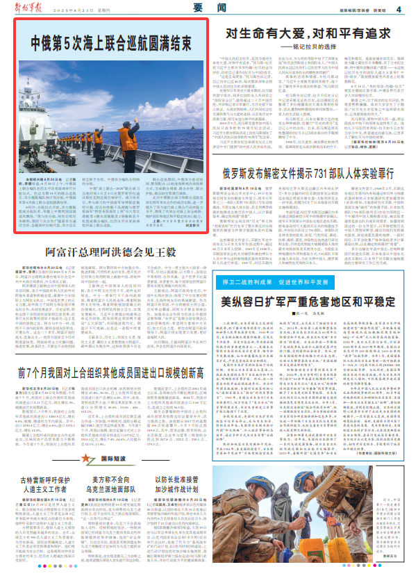 中俄“海上联合-2025”联合演习当地时间1日至5日在俄罗斯符拉迪沃斯托克附近海空域举行。演习结束后,参与演习的中国海军导弹驱逐舰绍兴舰、综合补给舰千岛湖舰与俄罗斯海军“特里布茨海军上将”号大型反潜舰等3艘水面舰艇及2架舰载直升机组成联合编队,位西太平洋某海域组织海上联合巡航。