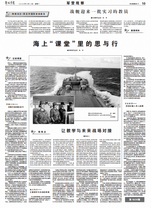航行的最后一天,军舰缓缓靠向码头。站在后甲板上,回望这艘一开始让不少教员心理产生“落差”的舰艇,此刻,他们的心中充满敬意。它的吨位或许不大,但它所承载的使命、所展现的战斗力、所凝聚的战斗精神,却重若千钧。记者坚信,当教员们把海味、兵味、战味融入教学课堂,一定会托举起一批批学员勇闯广阔的大洋、驶向更远的海疆。
