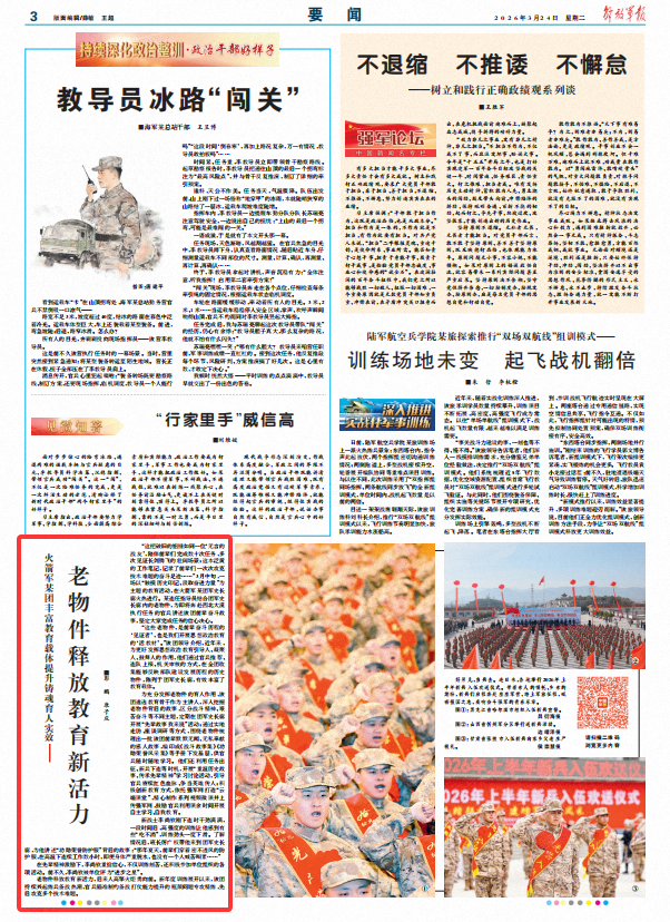 为充分发挥老物件的育人作用,该团遴选教育骨干作为主讲人,深入挖掘老物件背后的故事,区分战斗精神、艰苦奋斗等不同主题,定期在团军史长廊开展“先辈故事我来说”活动;通过实地走访、座谈调研等方式,围绕老物件梳理出一批该团前辈默默无闻、无私奉献的感人故事,编印成《战斗故事集》《功勋荣誉风采集》等手册下发基层,供官兵随时随地学习。他们还利用任务出征、新兵下连等时机,开展“重温历史故事、传承先辈精神”学习讨论活动,引导官兵赓续红色血脉、争当英雄传人;积极创新教育方式,依托强军网打造“云端课堂”,精心制作系列视频微课并上传强军网,鼓励官兵利用课余时间开展自主学习、自我教育。
