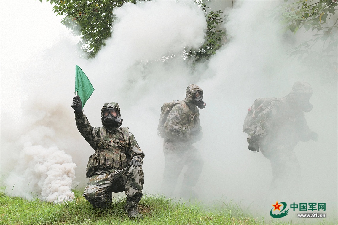炎炎夏日,火箭军某旅组织一场兼职岗位认证考核。考核场上,某发射营“三防”小组组长、二级上士小刘带领“三防”骨干,成战斗队形穿过“沾染地带”,进入充满“有毒气体”的帐篷内……