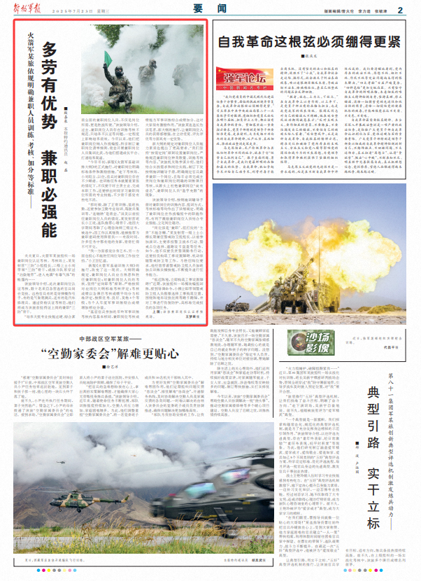 新大纲的规定对兼职岗位人员能力素质也提出了更高要求。“我们坚持‘按需定岗’原则设置兼职岗位,严格规范兼职岗位种类数量、训练考核等内容。”该旅机关陈参谋介绍,他们结合实战需求和岗位实践,制订下发按纲施训辅导手册,明确规定官兵最多兼职一个岗位,且每年必须完成主责岗位和兼职岗位明确的训练课目考核,从源头上杜绝兼职岗位“徒有虚名”、兼职岗位人员“滥竽充数”的现象。