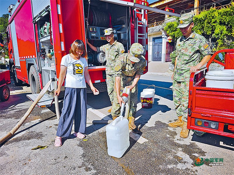 7月23日,火箭军工程大学官兵为水泉子村送水。解放军报特约记者 钟福明 摄