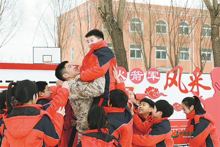 1月14日,火箭军某部官兵代表来到辽宁省法库县四家子乡蒙古族中心小学看望学生,与孩子们一起做游戏。王 冉摄