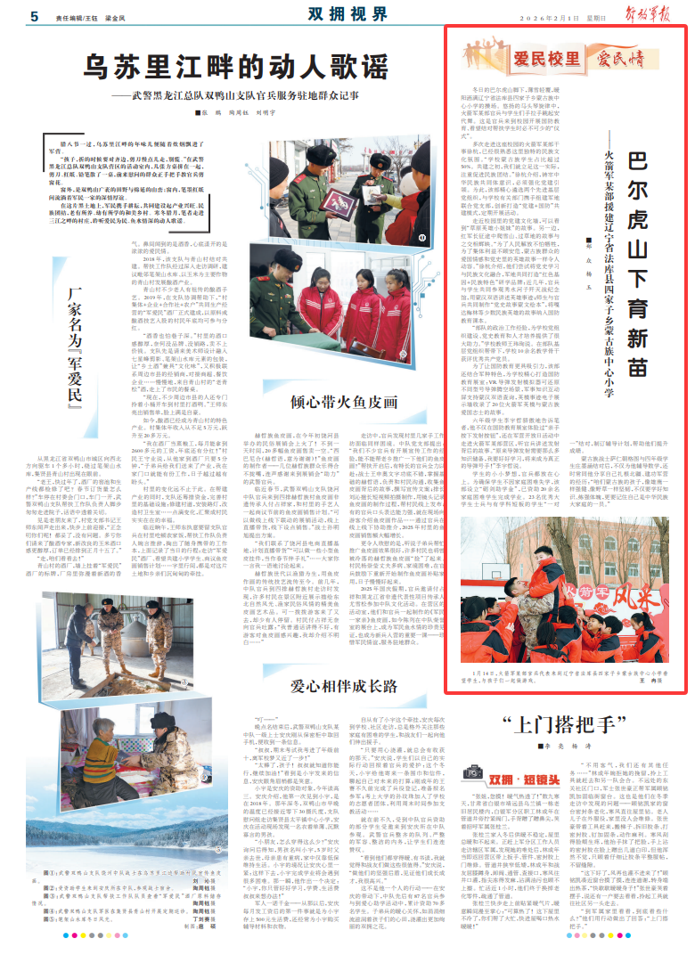 蒙古族战士萨仁朝格图与四年级学生庄墨涵结对后,不仅为他辅导数学,还时常同他分享自己扎根北疆、建功军营的经历:“咱们蒙古族的孩子,像雄鹰一样强健、像野草一样坚韧,不仅要学好知识、练强体魄,更要记住自己是中华民族大家庭的一员。”