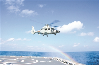 图①:日前,正在亚丁湾、索马里海域执行护航任务的中国海军第36批护航编队,在航渡途中组织战备演练,锤炼官兵遂行多样化任务能力。图为编队直升机从甲板起飞。
