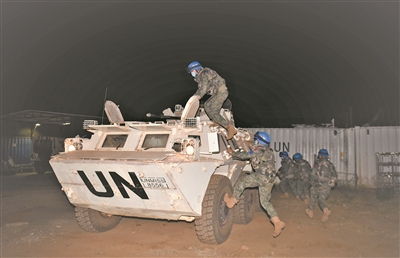 图②:当地时间4日,中国第7批赴南苏丹(朱巴)维和步兵营展开新年度首次应急战备演练,检验部队应急处突、有效履行使命任务的能力。图为官兵快速登上步战车。