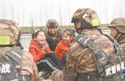 3月21日,武警安徽总队合肥支队组织特战队员展开38公里行军拉练、战场生存等课目演练。图为拉练途中休整时,几名家长带着孩子前来慰问,特战队员趁机向孩子们普及军事常识、指导体验武器装备,上了一堂生动的国防教育课。
