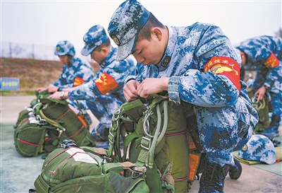 3月21日,空降兵某旅组织空降战斗演练,锤炼部队打赢能力。图为演练开始前,官兵整理伞具。 杨灏峰摄